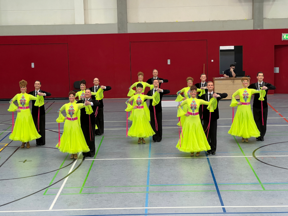 Der Aufbau für das geplante Abschlussturnier der Standardformationen der 2. Bundesliga Süd war bereits gestartet, als eine weitere corona-bedingte Absage kam und damit nur noch zwei Mannschaften übrig waren. Die Enttäuschung des Mainzer Teams war zunächst groß, hatten sie sich doch nach vier Siegen in Folge sehr auf das Saisonabschluss-Turnier vor heimischen Publikum gefreut. Schnell entschied sich das Team, dann eben eine Show zu tanzen. Auch die zweite verbliebene Mannschaft, das A-Team der FG Hofheim/Friedberg sagte dankenswerterweise zu, ebenfalls für eine Show anzureisen. So hieß es am Samstag Show-Time und beide Mannschaften lieferten tolle Leistungen ab, die vom Publikum mit viel Beifall belohnt wurden. Jede Formation präsentierte zwei Durchgänge, was die Mainzer Trainer Markus Mengelkamp und Yvonne Scheller dazu nutzten, zwei unterschiedliche Besetzungen tanzen zu lassen und damit jedem Mainzer Formationsmitglied den Auftritt vor Heimpublikum zu ermöglichen. Damit fand die Saison der 2. Bundesliga Süd zumindest für zwei Mannschaften noch einen gebührenden Abschluss.